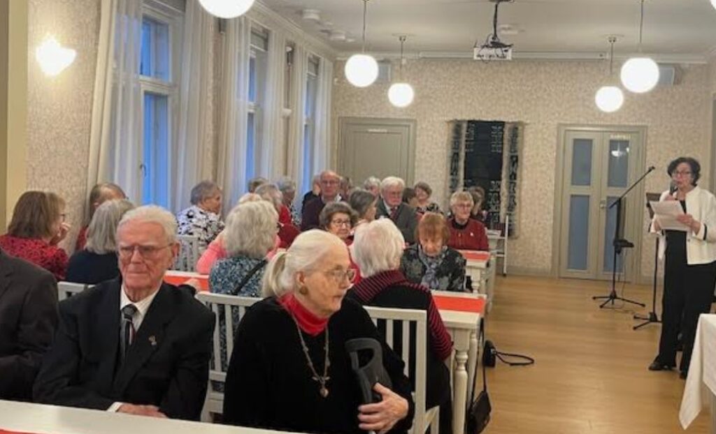 KIITOS kaikille osallistujille! Salit olivat Pappilassa täynnä. Tunnelma oli joulunodotteinen ja saimme nauttia mukavasta ohjelmasta. Tervetulopuheitten lisäksi trubaduuri viihdytti, Leena Kaarni säesti lauluja, Arja Ahlsved kertoi joulurunojen taustasta, Eero Peltonen luki Jouluevankeliumin Nurmijärven murteella. Kiitos maittavasta ruuasta myös Sirpa Karjalaiselle.